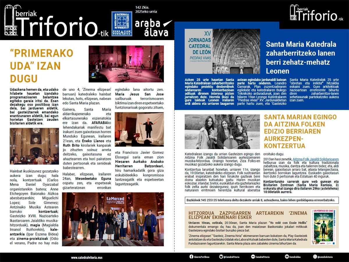 Estos meses están siendo muy especiales para nosotros. 25 años de vida de la Fundación en los que hemos trabajado junto a un gran equipo para que Santa María sea un gran referente patrimonial, cultural y turístico de Vitoria-Gasteiz -sin merma de su carácter religioso-, gracias a un proceso de restauración que se ha convertido en modelo a seguir.